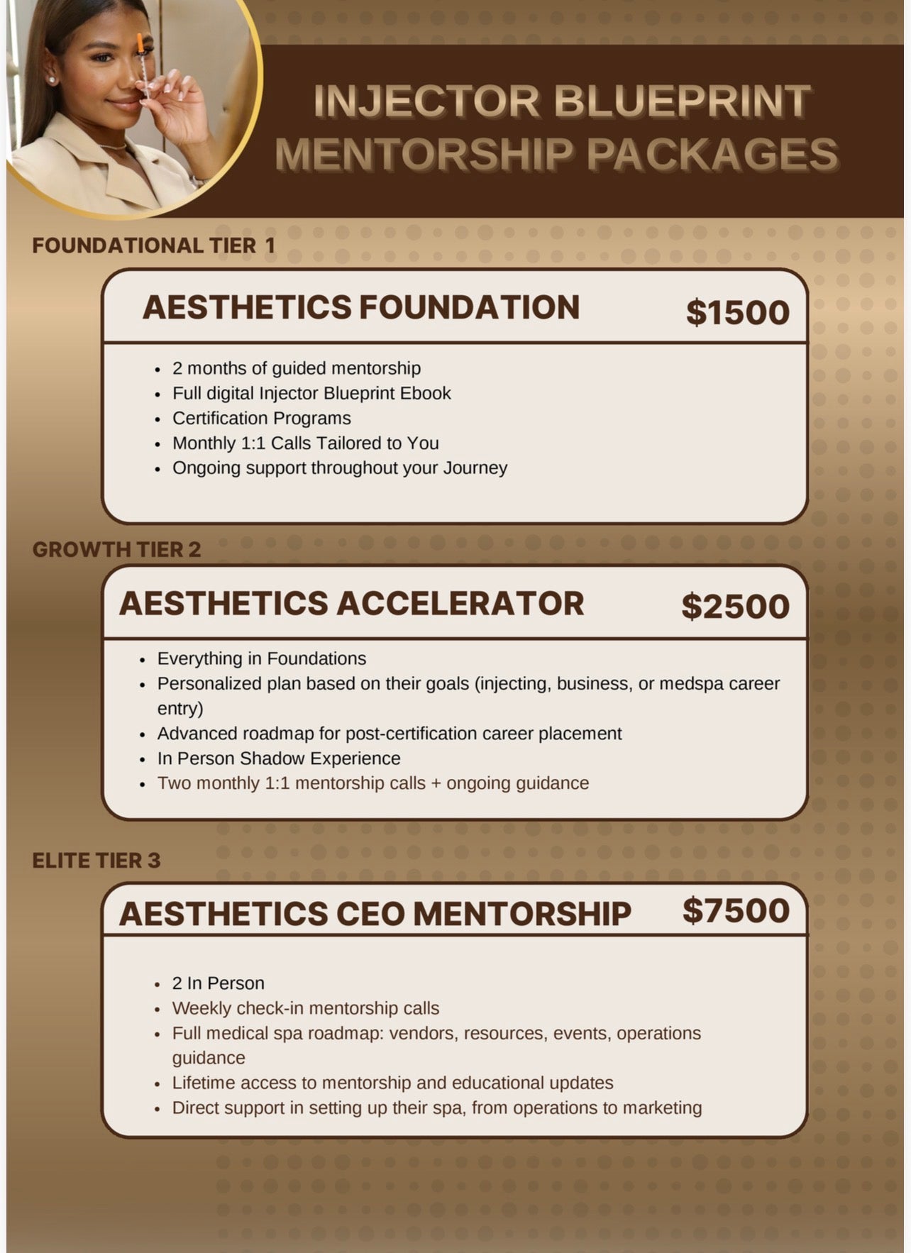 - Long Term Mentorship: Available to assist in your journey from the beginning and throughout your aesthetic journey. From building your foundation to potentially owning your own Medical Spa!
